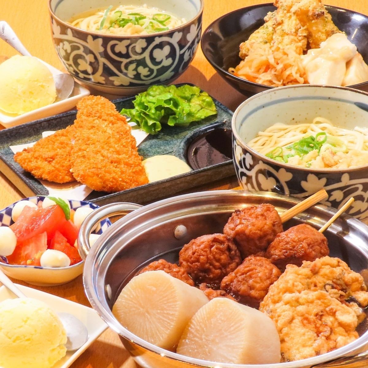 おばんざい、長崎おでん、松浦のアジフライの全3品が入った飲み放題付きコースでございます!2名様からご利用可能で様々なシーンでお使いいただけます。ご利用お待ちしております♪※写真は一例です。